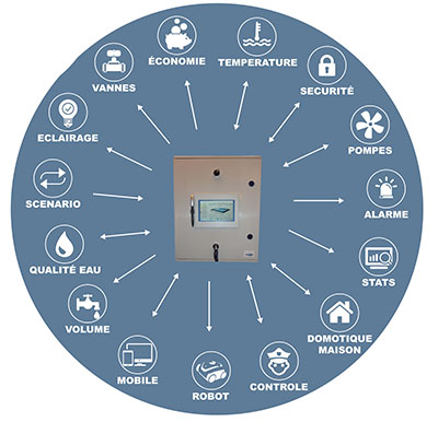 Unique on the market scenario modes, using a measuring system water level having no contact with the latter, the control of automatic valves, variation of the speed pumps with an external inverter, management of two different basins…